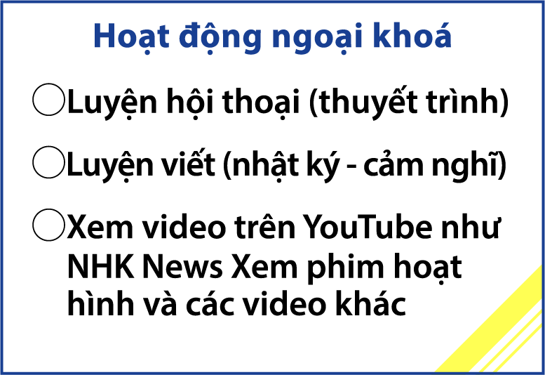 Do chương trình học ở trường tiếng Nhật diễn ra nửa ngày, vào thời gian không có lớp, bạn có thể tham gia hoạt động ngoại khóa của trường hoặc các lớp hội thoại bên ngoài để tăng cơ hội tiếp xúc với tiếng Nhật; đồng thời cũng có thể đến trụ sở chính để hỗ trợ một phần công việc/ độ hiểu biết về công việc, bạn sẽ tham gia chương trình thực tập.