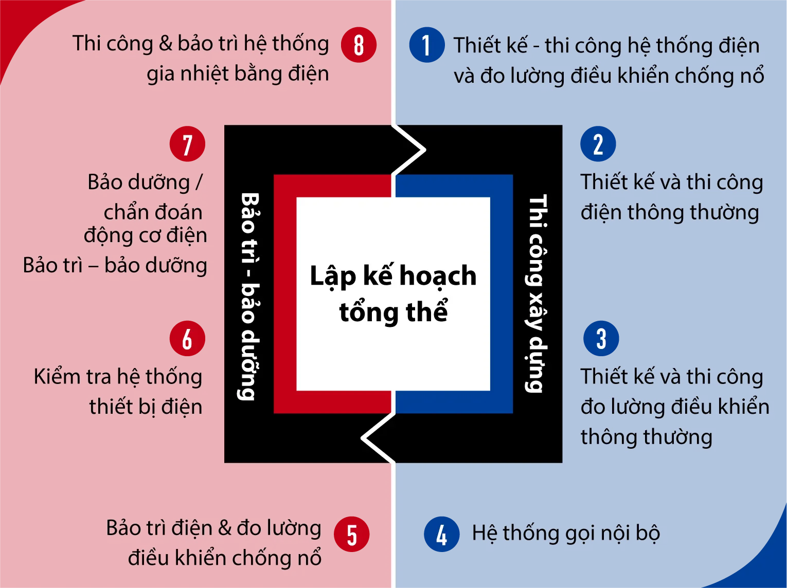 thể cho thiết bị nhà máy“Plant” là thuật ngữ chỉ toàn bộ hệ thống nhà xưởng/thiết bị nhà máy dùng để tạo ra một sản phẩm nào đó. Công ty chúng tôi lấy Thi công xây dựng và bảo trì – bảo dưỡng làm hai trụ cột, qua đó hiện thực hoá giải pháp lập kế hoạch tổng thể cho plant. Trong mảng thi công xây dựng, chúng tôi thực hiện các dự án xây dựng mới ở nhiều lĩnh vực đa dạng như: nhà máy lọc dầu & plant hoá chất, plant thực phẩm & dược phẩm, nhà máy bán dẫn,…Trong mảng bảo trì – bảo dưỡng, chúng tôi đóng góp cho khách hàng trên phạm vi rộng như: sửa chữa nhỏ/thi công nhỏ trong khuôn viên plant, kiểm tra, thử nghiệm & chẩn đoán, bảo dưỡng động cơ điện, cũng như chẩn đoán tuổi thọ còn lại của động cơ điện, cáp và ắc quy,… Nhờ đó, chúng tôi nhận được sự tin tưởng vững chắc từ khách hàng.Với mô hình hỗ trợ trọn gói xuyên suốt, chúng tôi đáp ứng các nhu cầu ngày càng đa dạng của thời đại, đồng thời hướng đến sự phát triển hơn nữa.