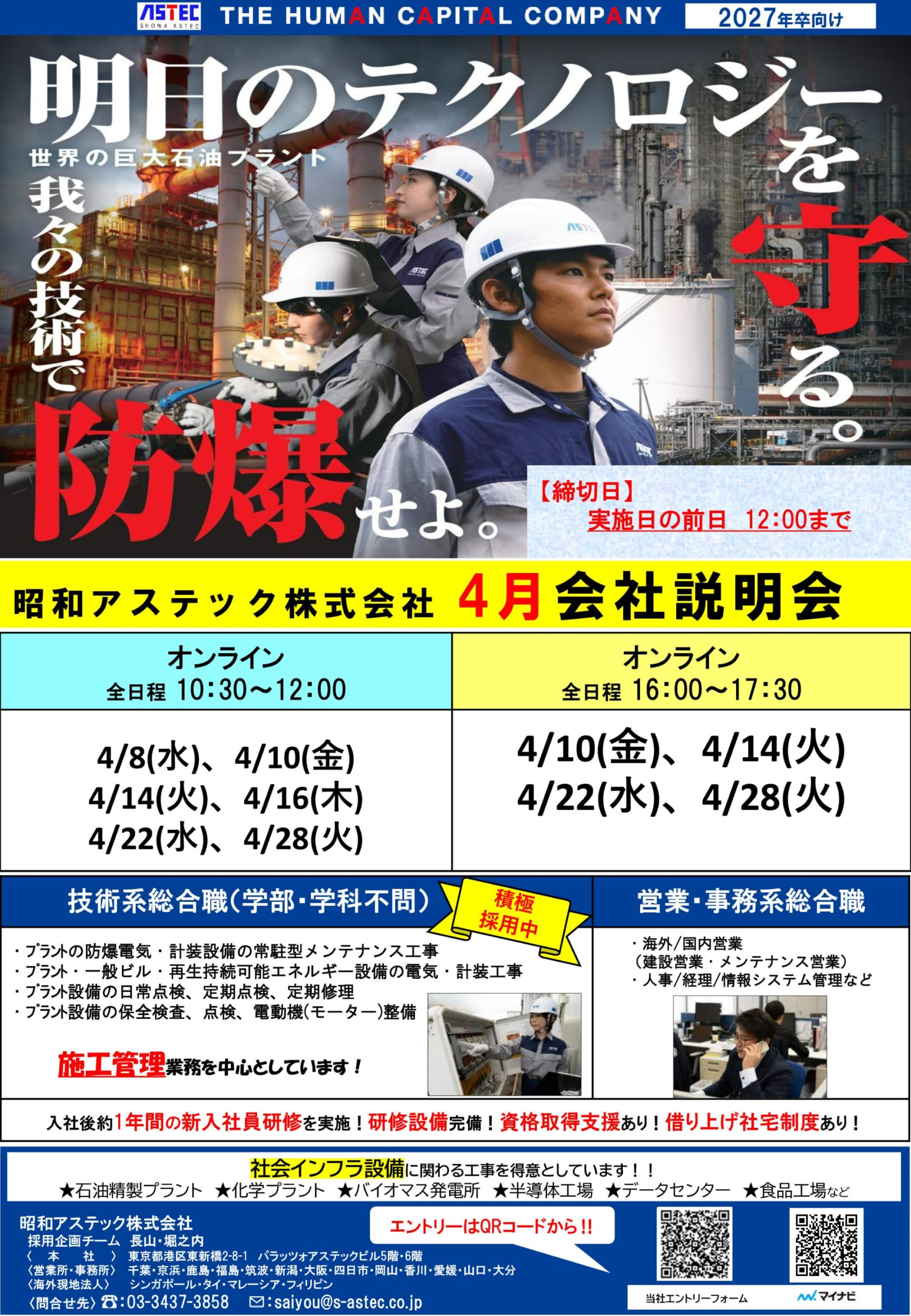 2027年度卒業予定の学生様向けの当社「4月 会社説明会」をお知らせいたします。